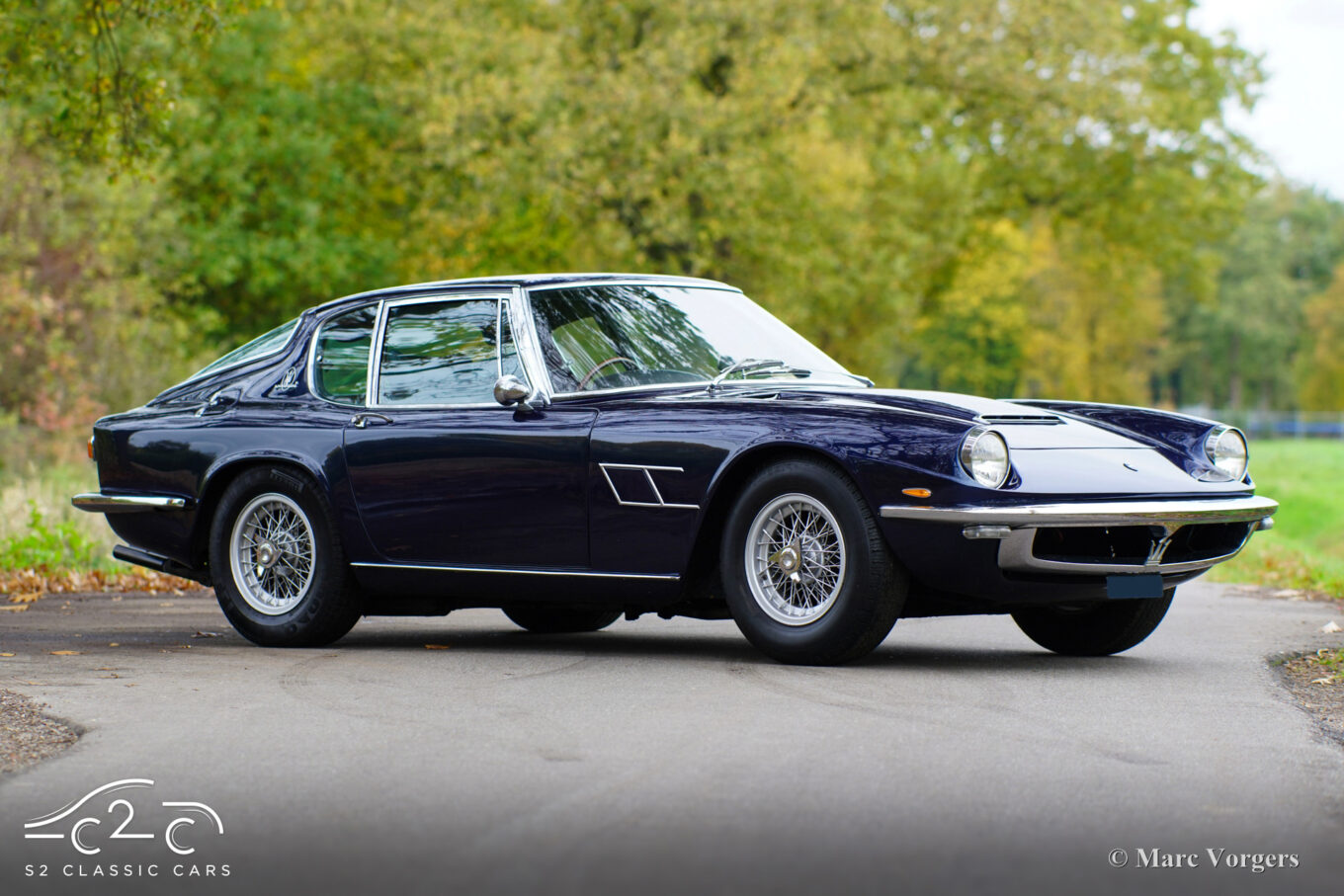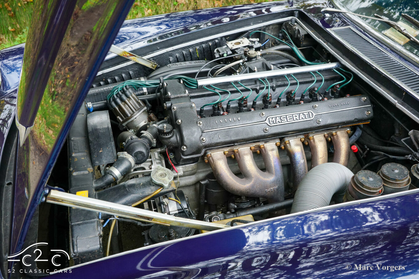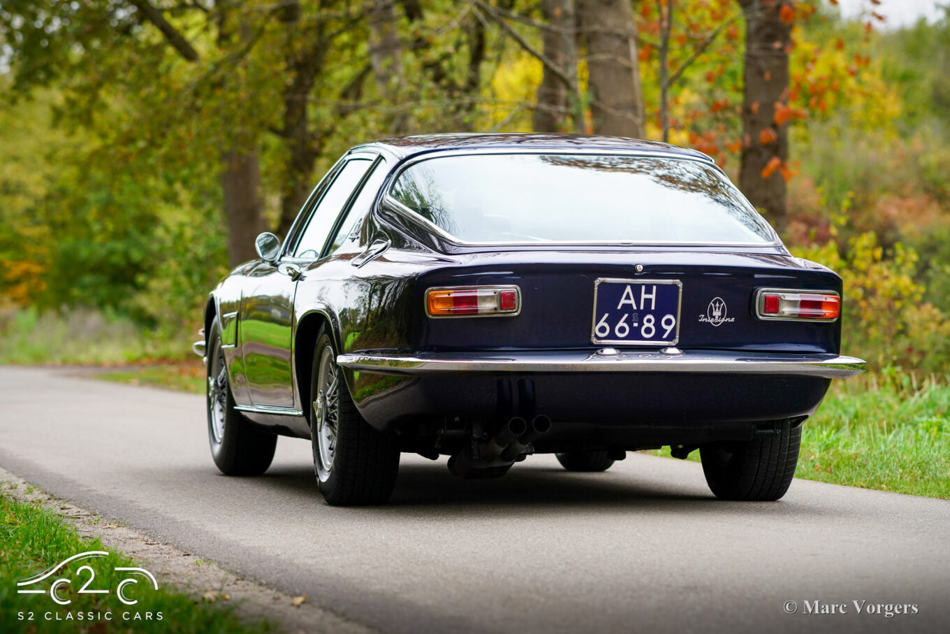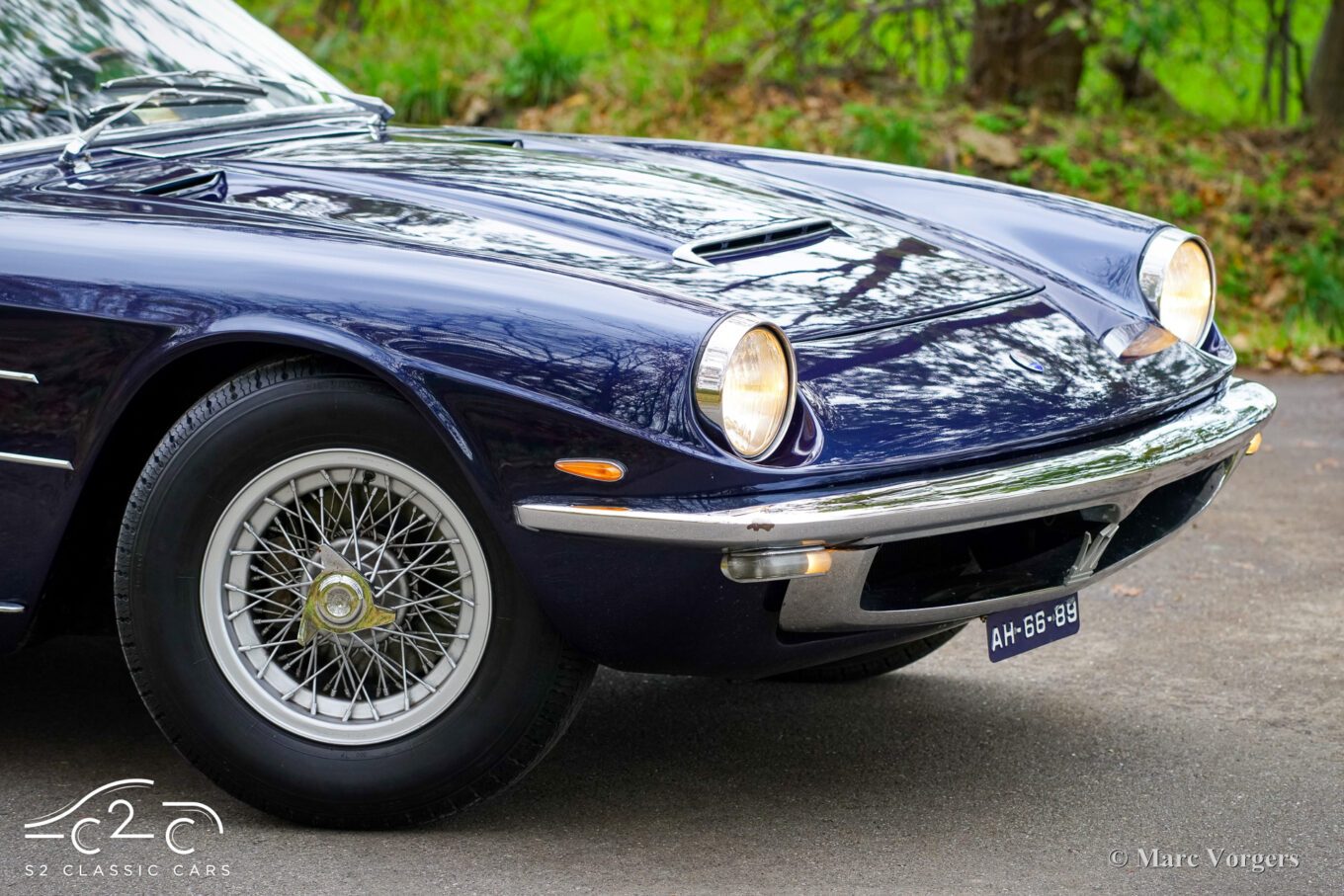 Carrosseriekleur donkerblauw metallic (Blu Pervinca 106AR357) gecombineerd met een blauw lederen interieur afgewerkt met rood tapijt. Deze schitterende Maserati werd gebouwd op 9 mei 1966 en aansluitend geleverd aan de eerste eigenaar in Verona, Italië. Vanuit Italië vond de auto een nieuw thuis in Duitsland bij de heer Hans Haemer, die de auto vervolgens in 1982 verkocht aan de vader van de huidige eigenaar. De familie bezit en koestert deze bijzondere auto al 43 jaar!