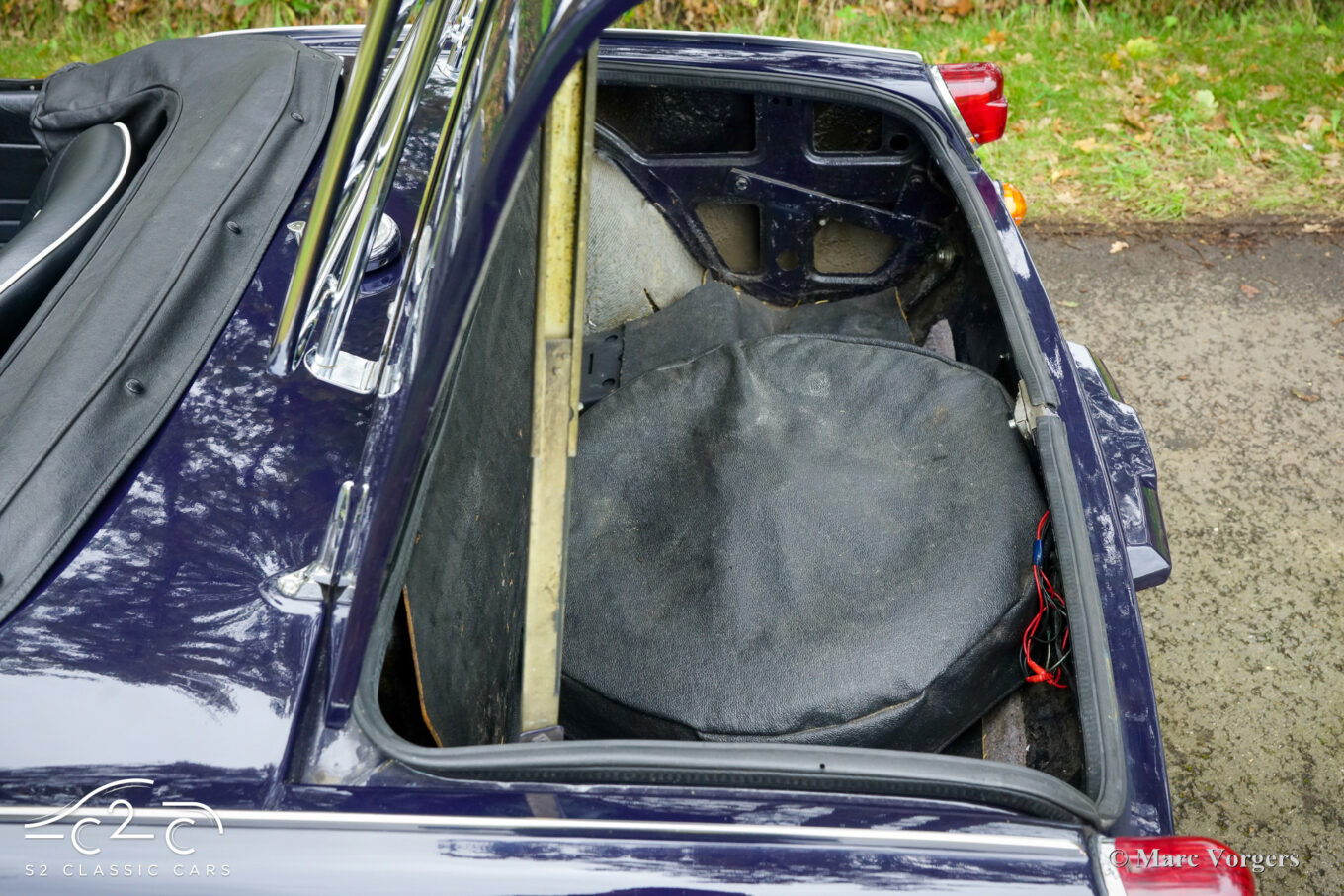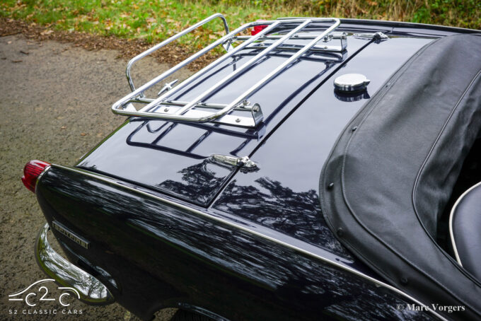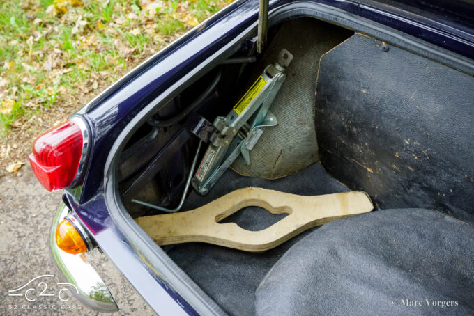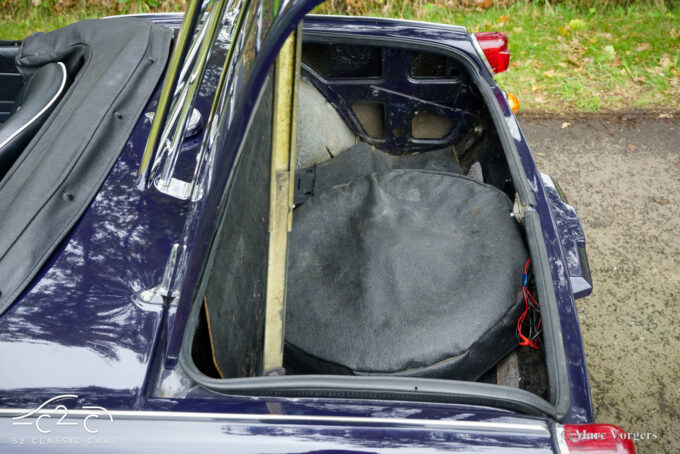 Dit prachtige exemplaar in Royal Blue verkeert in een goede tot zeer goede staat en de auto is onlangs uitgebreid onderhouden in onze werkplaats. De auto is uitgerust met overdrive, chromen spaakwielen, chromen ‘knock-on’ wielmoeren, een chromen bagagerek, een sportstuur met houten rand, rembekrachtiging, een opbergkluisje voor waardevolle spullen achterin, een krik, een houten wielmoersleutel en een ‘moderne’ JVC KD-452 stereo radio-cd-speler met Aux-ingang en een antenne op het rechter voorspatbord.