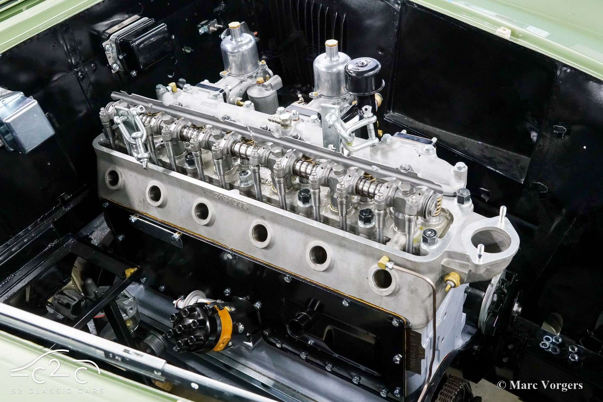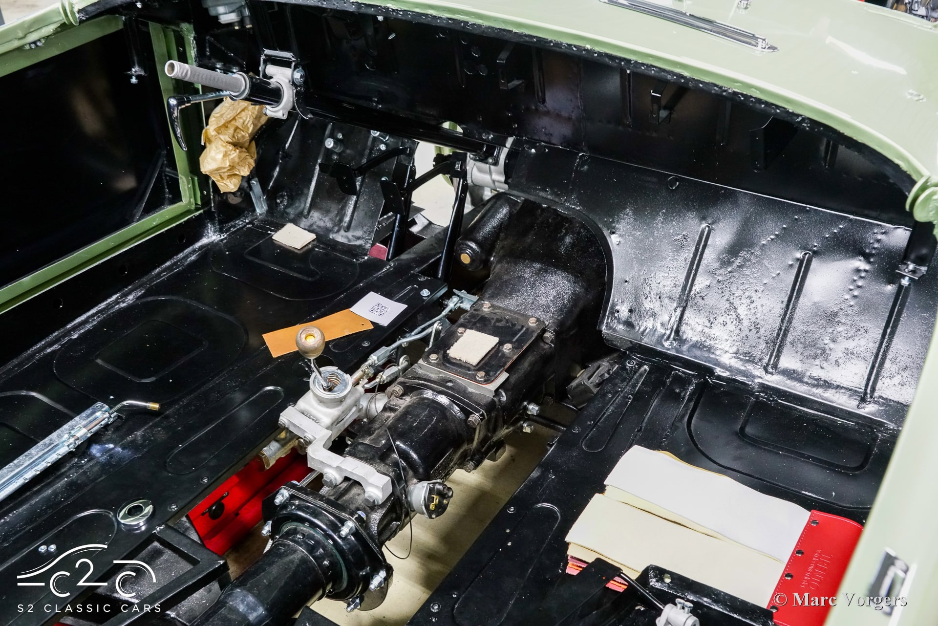 In the meantime, all the mechanical components were cleaned, overhauled, and rebuilt by the specialists in our technical workshop. The 4.1 Litre straight six engine was slightly modified to deliver a few more horsepower, and to increase the reliability. A new induction manifold was engineered and cast to accommodate 3 S.U. H6 carburettors instead of the original two Carter carbs. The gearbox, differential, rear axle, and drive axle were overhauled and painted in the correct colours. The very special Healey independent front suspension system was also fully rebuilt.