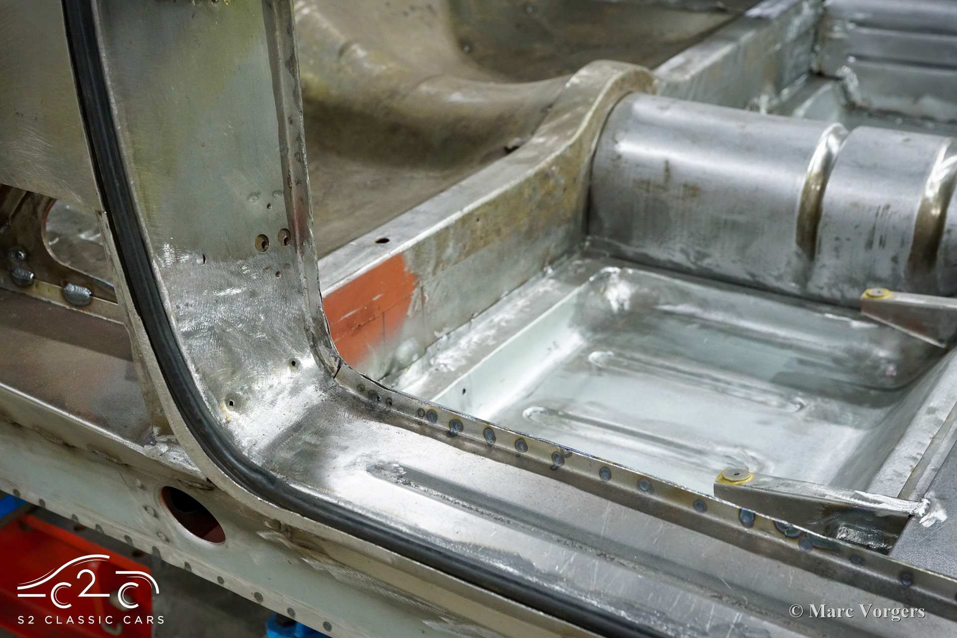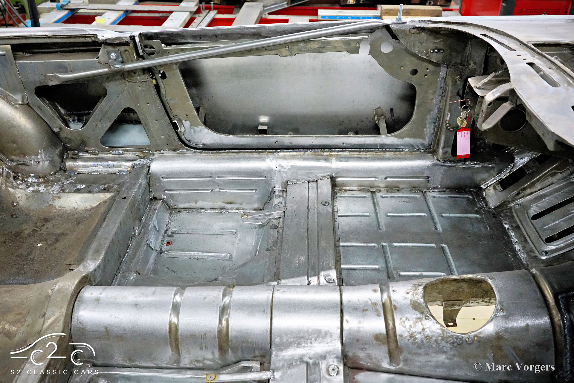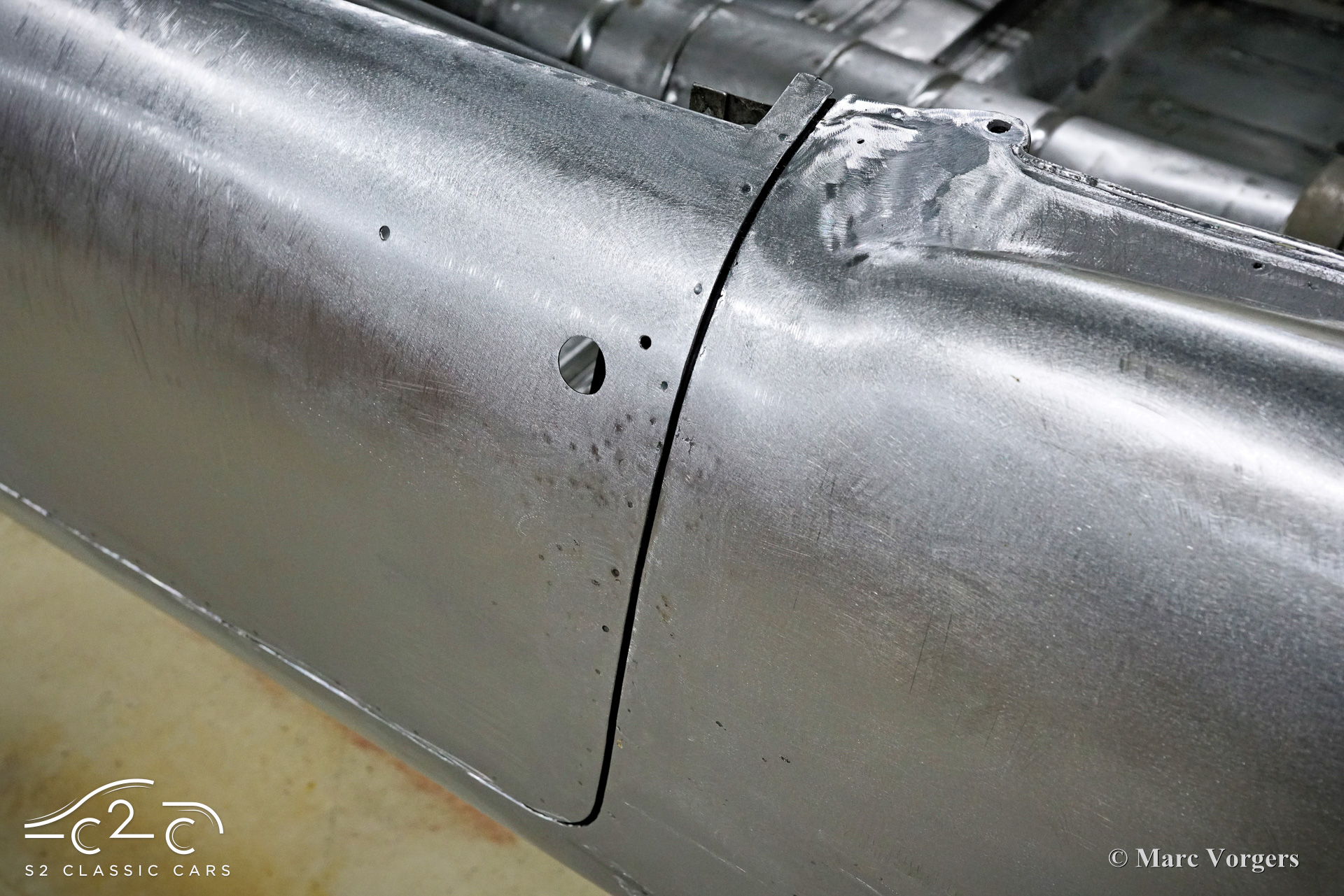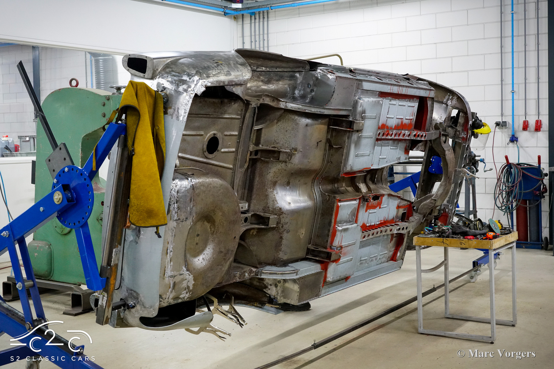 Hoewel deze auto geen schade heeft opgelopen, bleek bij een recente inspectie dat de carrosserie meer aandacht nodig had om de auto in topconditie te brengen. In 2023 is daarom begonnen met een grondige restauratie van de carrosserie, waarbij de auto tot op het chassis werd gedemonteerd. De carrosserie wordt zorgvuldig hersteld volgens de originele fabrieksspecificaties, met vernieuwingen zoals het vervangen van de bodem en de dorpels. Deze werkzaamheden worden gefaciliteerd door onze eigen plaatwerkerij en werkplaats, gespecialiseerd in plaatwerk voor oldtimers en restauratie van klassieke auto’s, met ervaren vakmensen.
