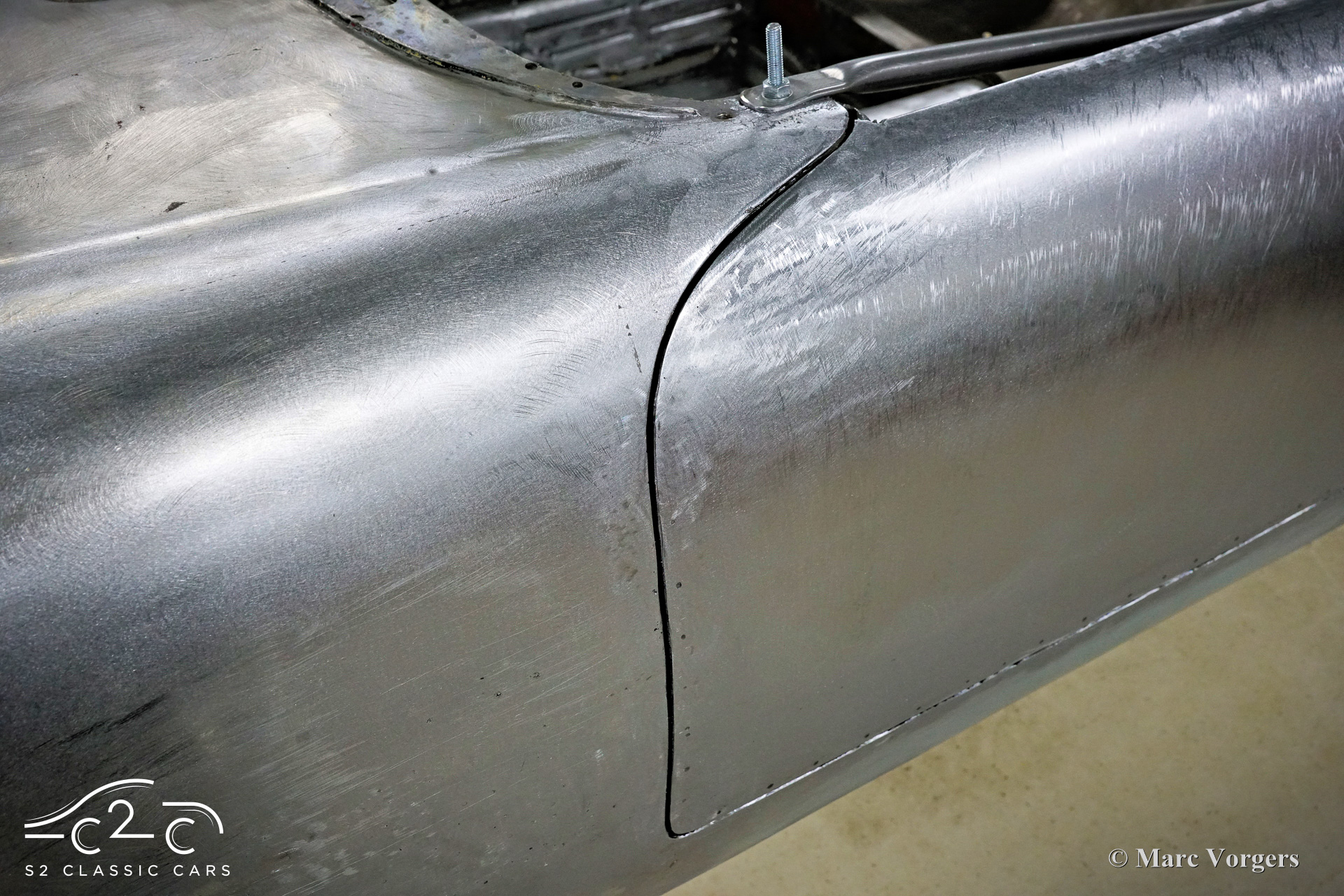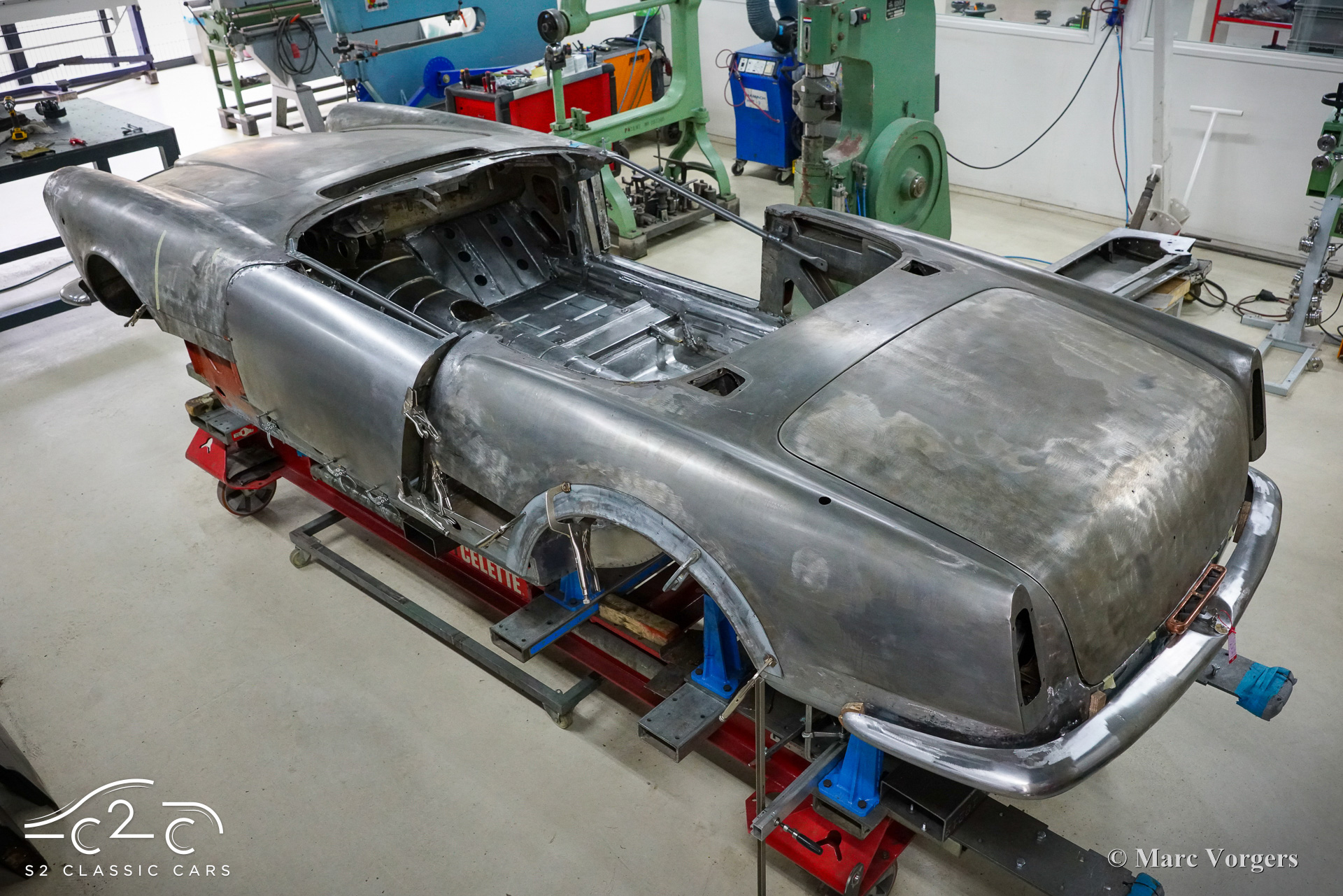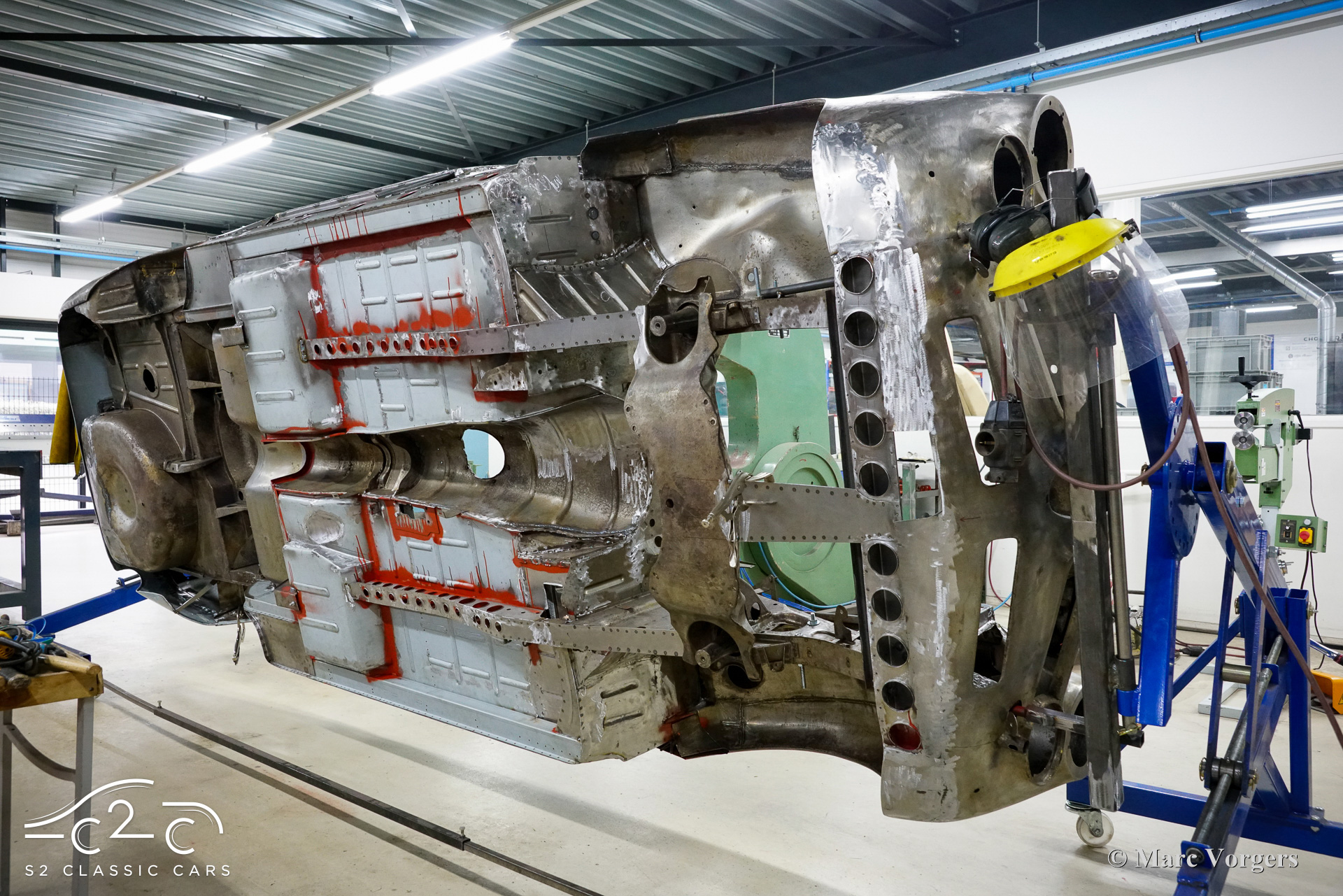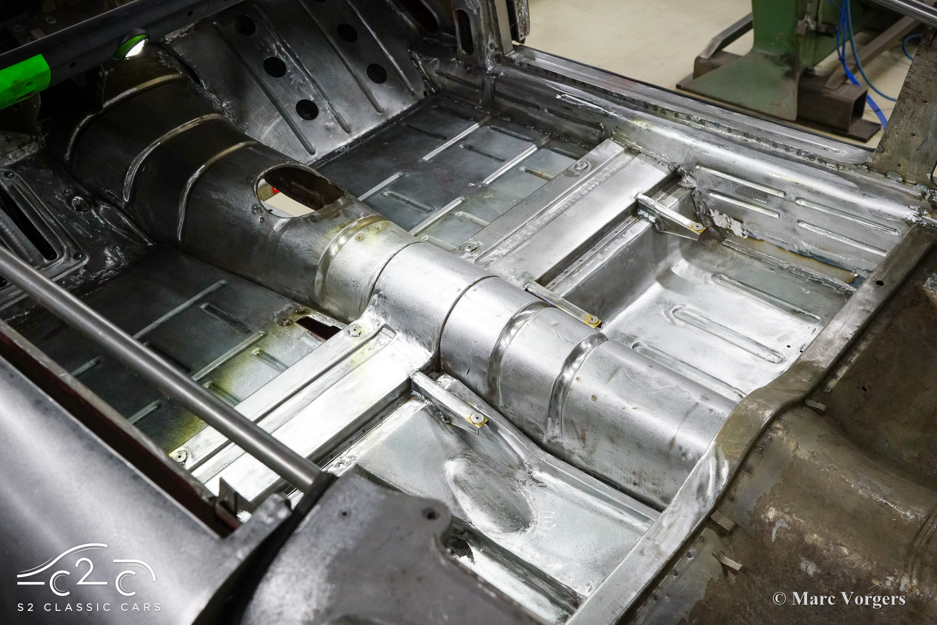 Hoewel deze auto geen schade heeft opgelopen, bleek bij een recente inspectie dat de carrosserie meer aandacht nodig had om de auto in topconditie te brengen. In 2023 is daarom begonnen met een grondige restauratie van de carrosserie, waarbij de auto tot op het chassis werd gedemonteerd. De carrosserie wordt zorgvuldig hersteld volgens de originele fabrieksspecificaties, met vernieuwingen zoals het vervangen van de bodem en de dorpels. Deze werkzaamheden worden gefaciliteerd door onze eigen plaatwerkerij en werkplaats, gespecialiseerd in plaatwerk voor oldtimers en restauratie van klassieke auto’s, met ervaren vakmensen.