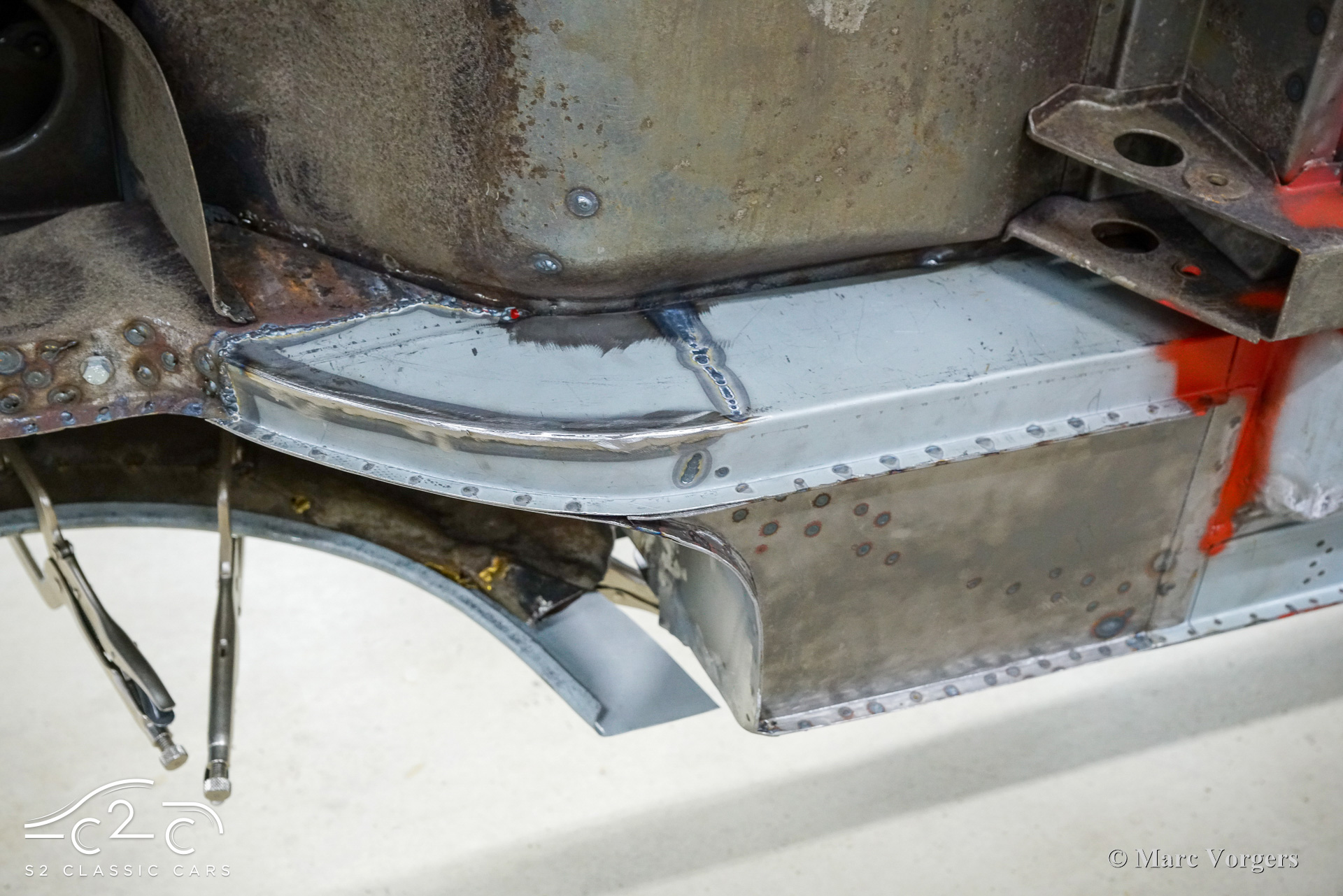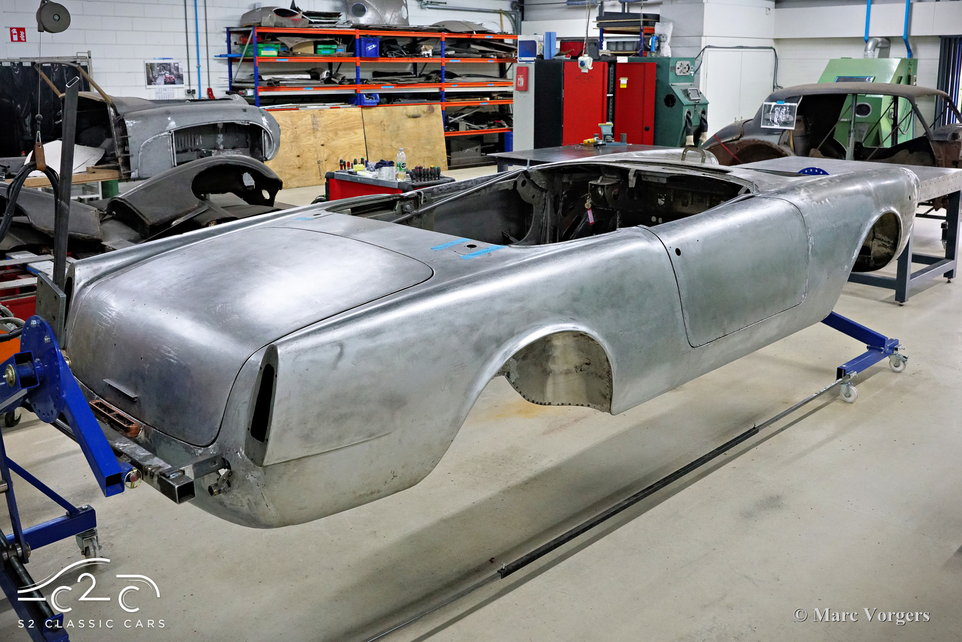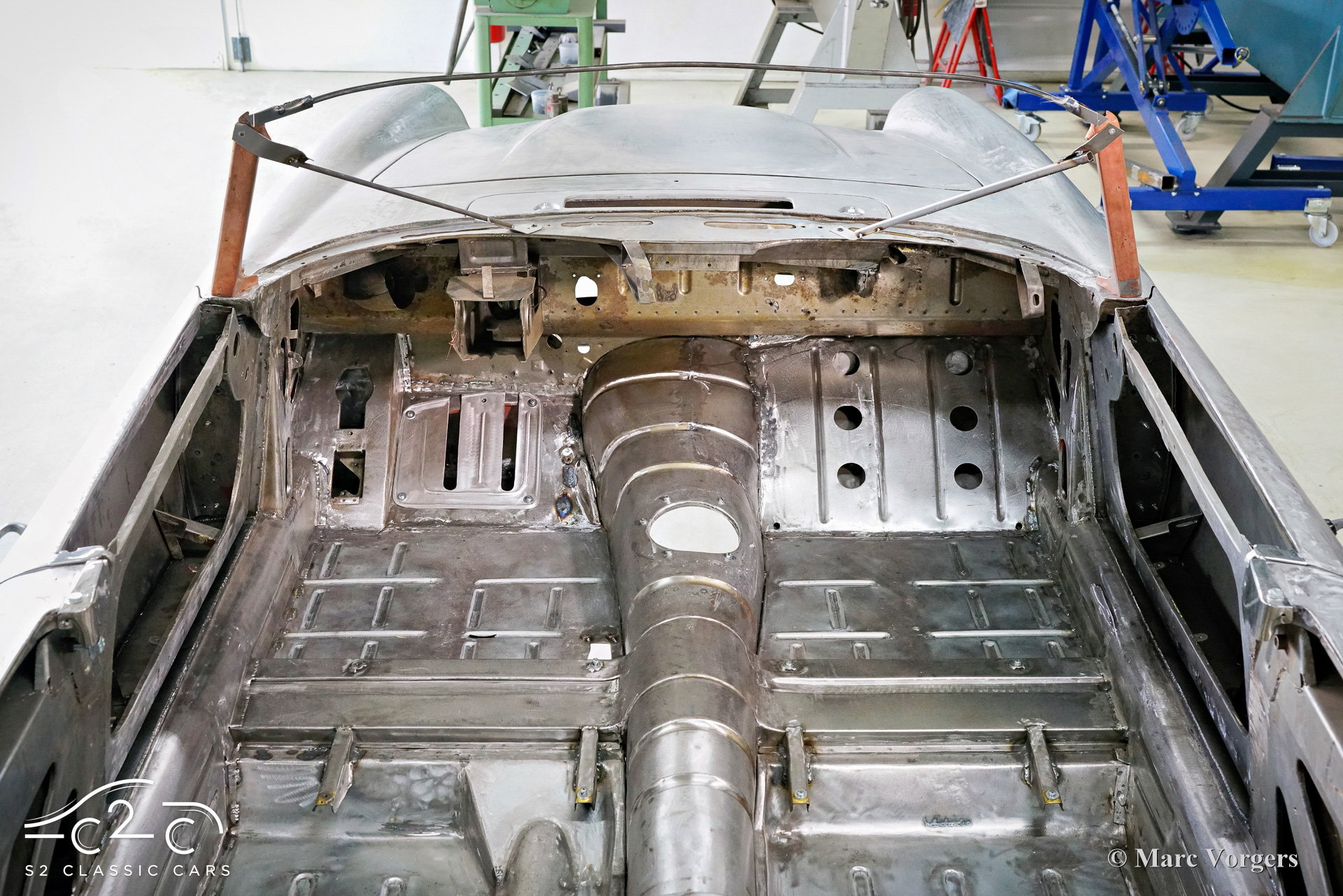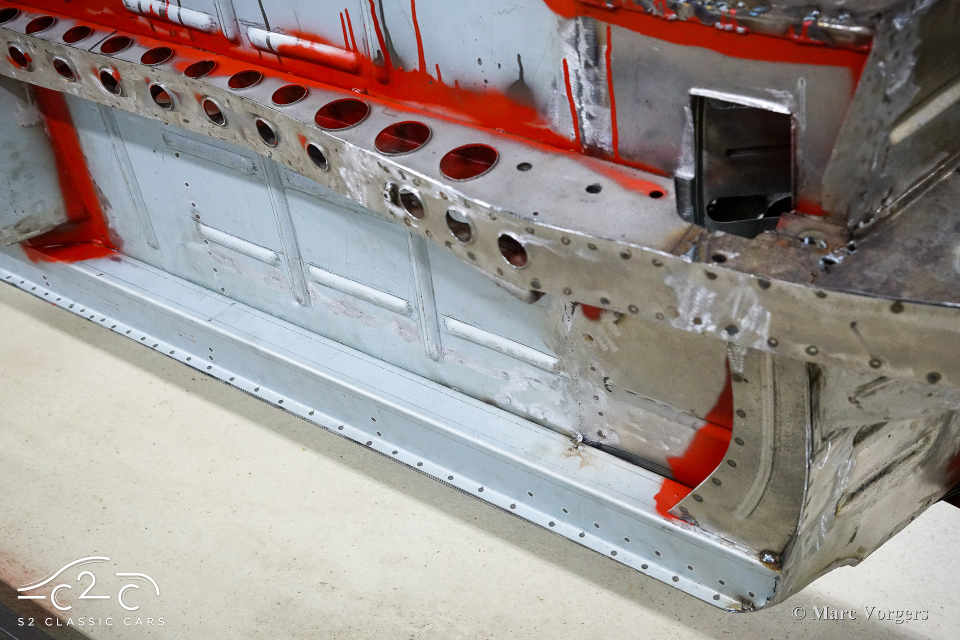 Hoewel deze auto geen schade heeft opgelopen, bleek bij een recente inspectie dat de carrosserie meer aandacht nodig had om de auto in topconditie te brengen. In 2023 is daarom begonnen met een grondige restauratie van de carrosserie, waarbij de auto tot op het chassis werd gedemonteerd. De carrosserie wordt zorgvuldig hersteld volgens de originele fabrieksspecificaties, met vernieuwingen zoals het vervangen van de bodem en de dorpels. Deze werkzaamheden worden gefaciliteerd door onze eigen plaatwerkerij en werkplaats, gespecialiseerd in plaatwerk voor oldtimers en restauratie van klassieke auto’s, met ervaren vakmensen.