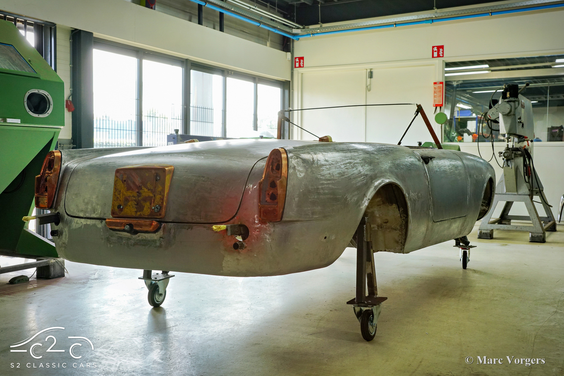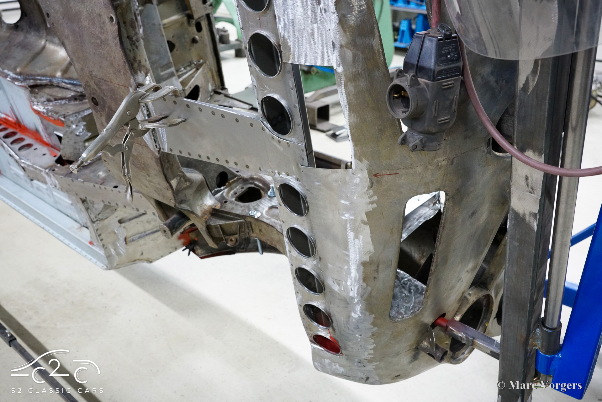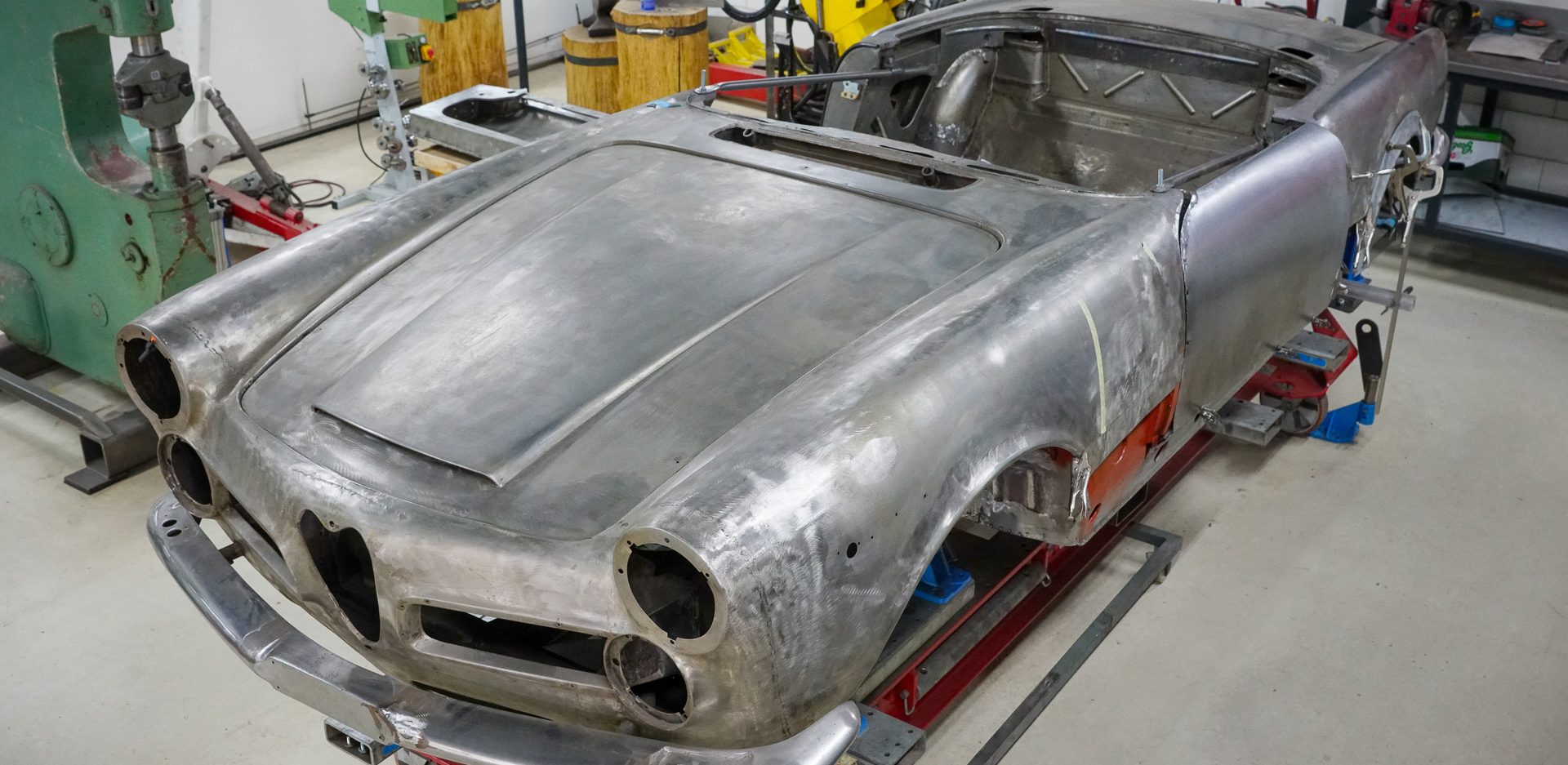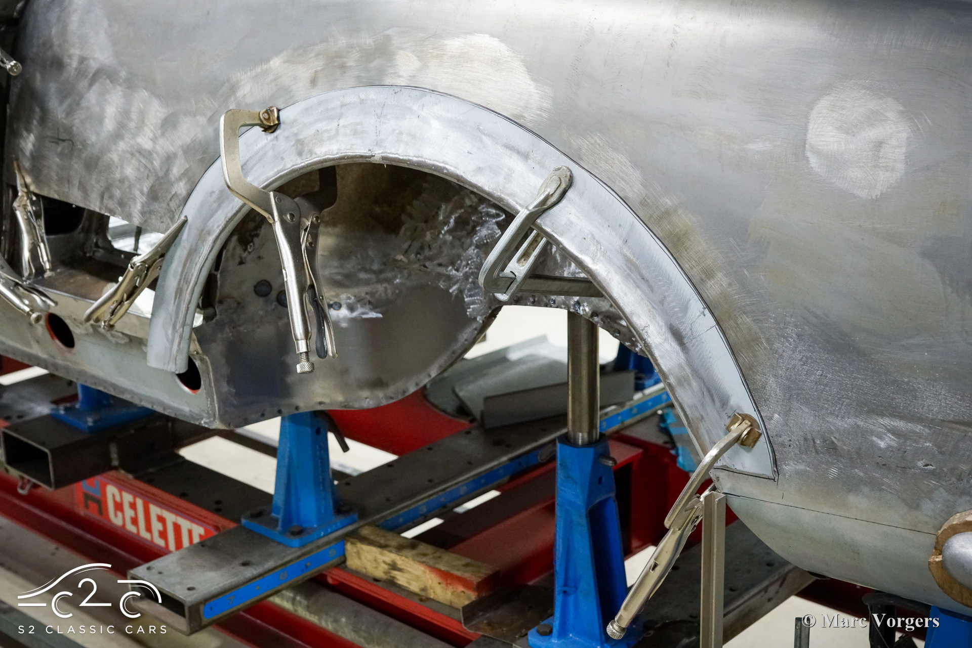 Hoewel deze auto geen schade heeft opgelopen, bleek bij een recente inspectie dat de carrosserie meer aandacht nodig had om de auto in topconditie te brengen. In 2023 is daarom begonnen met een grondige restauratie van de carrosserie, waarbij de auto tot op het chassis werd gedemonteerd. De carrosserie wordt zorgvuldig hersteld volgens de originele fabrieksspecificaties, met vernieuwingen zoals het vervangen van de bodem en de dorpels. Deze werkzaamheden worden gefaciliteerd door onze eigen plaatwerkerij en werkplaats, gespecialiseerd in plaatwerk voor oldtimers en restauratie van klassieke auto’s, met ervaren vakmensen.